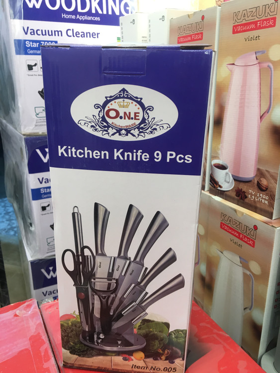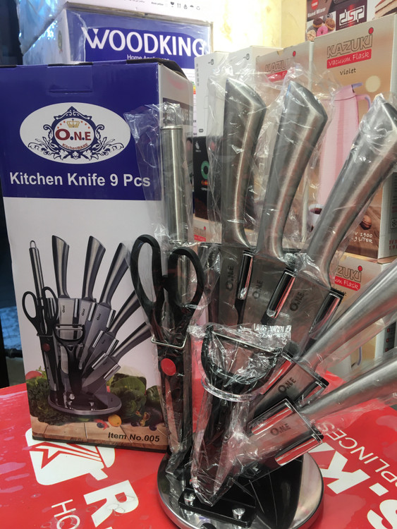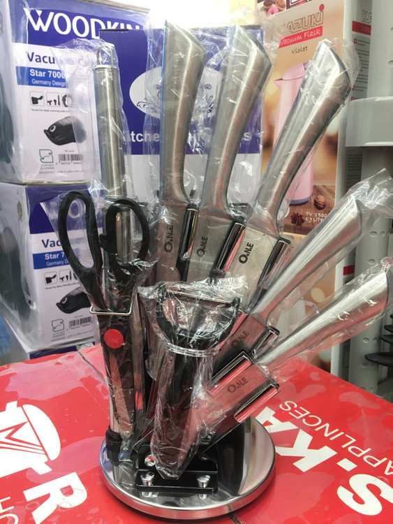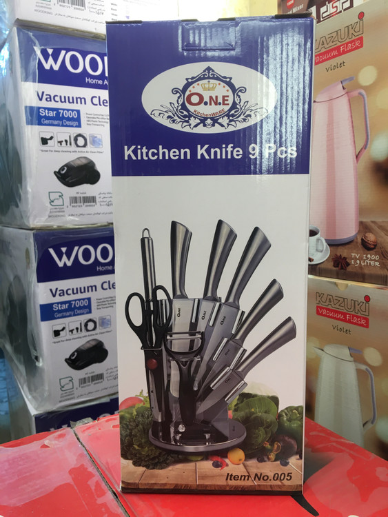سرویس چاقو 9تیکه 1.چاقوی ساطور7 اینچی 2.چاقوی سراشپز 8اینچی 3.چاقوی برش 8اینچی 4.چاقوی کاربردی5اینچی 5.چاقوی پوست کن 3.5اینچی 6.1عدد چاقو تیز کن فولادی 7.5 اینی 7.تک قیچی 8. 1عددپوست کن سرامیکی 9. استند چرخشی